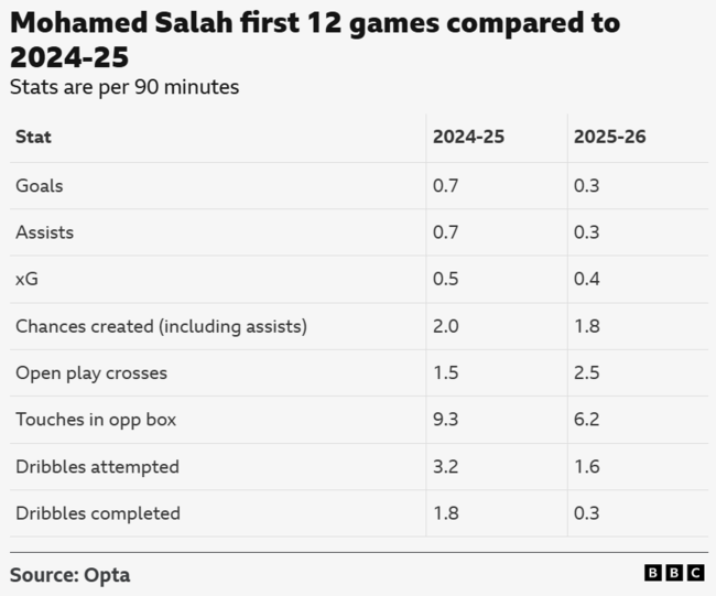 BBC와 옵타(Opta)의 통계에 따르면 살라는 이번 시즌 리그 12경기에서 3골 3도움을 기록 중이다. 지난해 같은 시점의 7골 7도움에 비하면 절반 수준. 경기당 페널티박스 내 터치는 6.2회(지난 시즌 9.6회), 드리블 시도는 1.6회(전 시즌 3.4회)로 절반 가까이 줄었다. 또한 경기당 평균 슈팅과 기대득점(xG) 수치 모두 리버풀 이적 후 최저다.