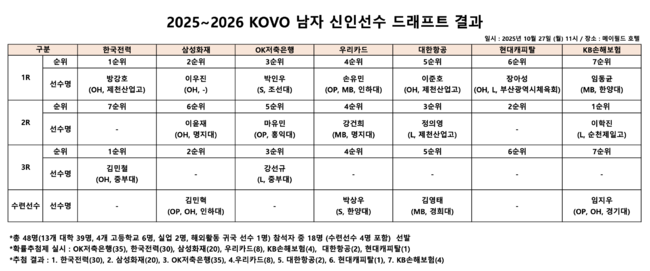드래프트 지명 순위는 지난 시즌 성적 역순에 따라 OK저축은행(35%), 한국전력(30%), 삼성화재(20%), 우리카드(8%), KB손해보험(4%), 대한항공(2%), 현대캐피탈(1%)의 확률로 추첨이 진행됐다.