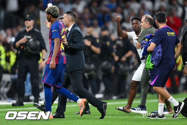 한 차례 진정되는 듯했지만 비니시우스가 멀리서 다시 야말을 향해 고함을 지르며 감정이 재점화됐다. 벤치에 있던 안토니오 뤼디거, 다비드 알라바, 하피냐까지 그라운드로 뛰어들었고 현장은 난장판이 됐다. 결국 마르쿠스 소르그 코치가 급히 선수들을 제지하며 큰 충돌로 번지는 것을 가까스로 막았다.