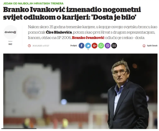 크로아티아 언론 ‘티포탈’은 30일 “이반코비치가 35년의 지도자 생활을 마감하고 은퇴를 결정했다. 그는 다음 생일에 72세가 된다”고 발표했다.