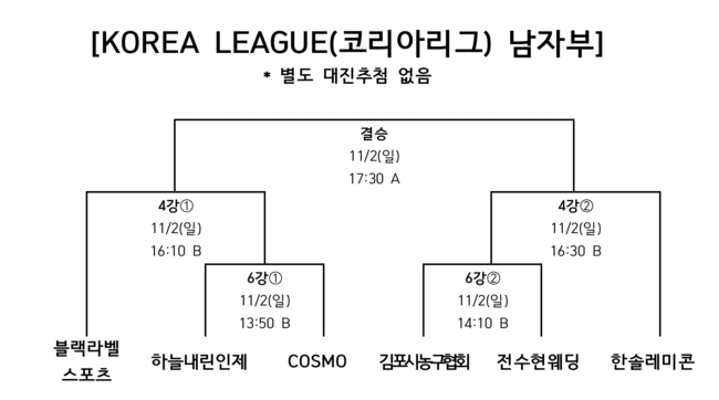 코리아리그부에서 블랙라벨스포츠(2승)와 한솔레미콘(3승)이 전승으로 4강 토너먼트에 직행했다. 블랙라벨스포츠는 1차전서 코스모를 21-17로 눌렀고 2차전서 김포시농구협회를 21-9로 제압했다.