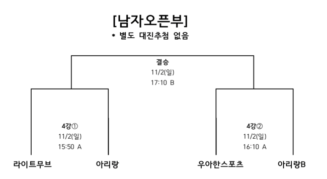 남자오픈부에서 라이트무브 대 아리랑, 우아한스포츠 대 아리랑B가 만나 우승컵을 다툰다.