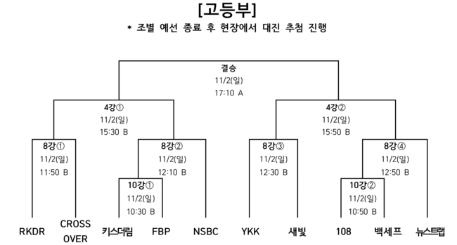 가장 치열한 부는 고등부였다. 10팀이 10강 토너먼트부터 우승컵을 다툰다. 키스더림 대 FBP, 108 대 백세프의 10강 승자 최종 두 팀이 8강에 합류한다.