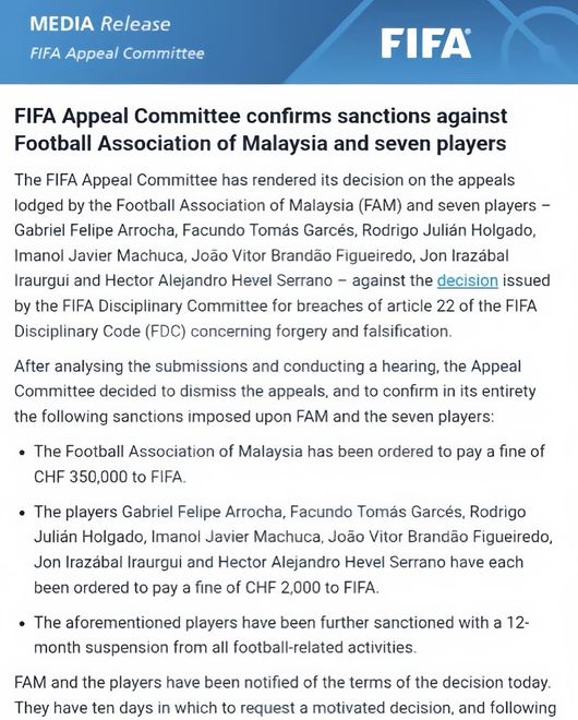 매체는 "FAM이 FIFA에 제기한 법적 노력이 막다른 길에 봉착했다. FIFA 항소위원회는 말레이시아 대표팀 귀화 선수 7명의 서류 위조 스캔들과 관련된 FAM의 항소를 공식적으로 기각했다. 이로써 벌금 및 12개월 출장 정지 중징계가 유지된다"라고 전했다.