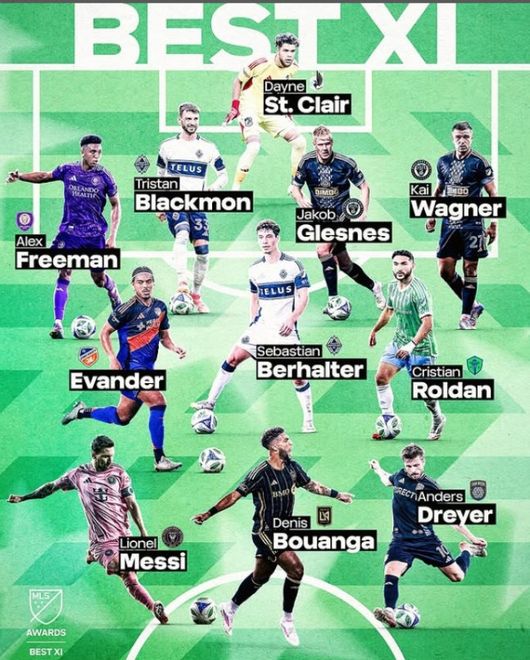4-3-3 포메이션으로 구성된 베스트11에는 드니 부앙가, 리오넬 메시(인터 마이애미), 안데르스 드레이어(샌디에이고)가 공격진을 구성했다. MLS는 “부앙가는 2025시즌 리그 최초로 3년 연속 20골을 달성했다”며 “그는 LAFC 역대 득점왕 카를로스 벨라를 넘어섰고, 손흥민과 함께 리그 최고 공격 듀오를 형성했다”고 소개했다.