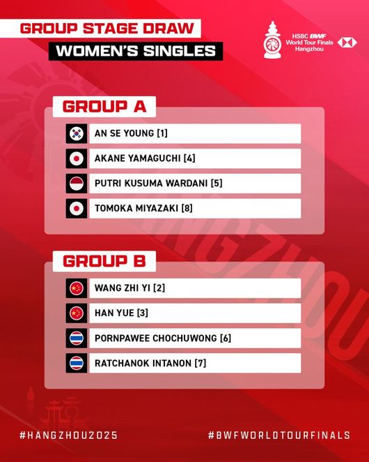 조 추첨 결과 야마구치가 안세영이 있는 A조로 향했고, 한웨는 왕즈이가 있는 B조에 들어가면서 집안 싸움을 벌이게 됐다. 이어 와르다니와 미야자키가 A조, 초추웡과 인타논이 B조에 배정되며 마무리됐다.