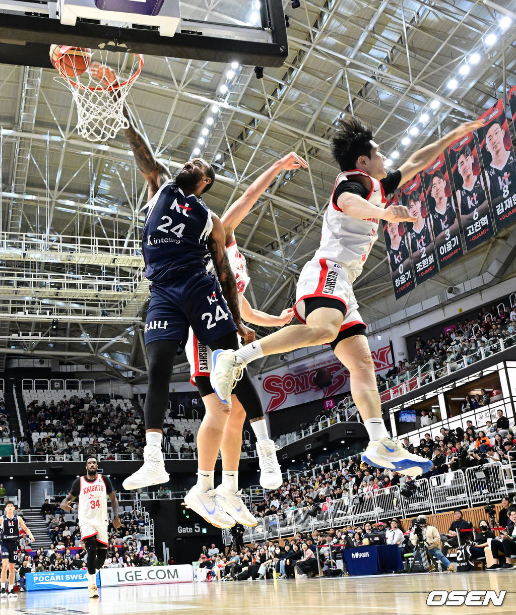 2쿼터 KT 데릭 윌리엄스가 SK 수비를 피해 원핸드 덩크를 시도하고 있다. 2025.12.14 /jpnews@osen.co.kr