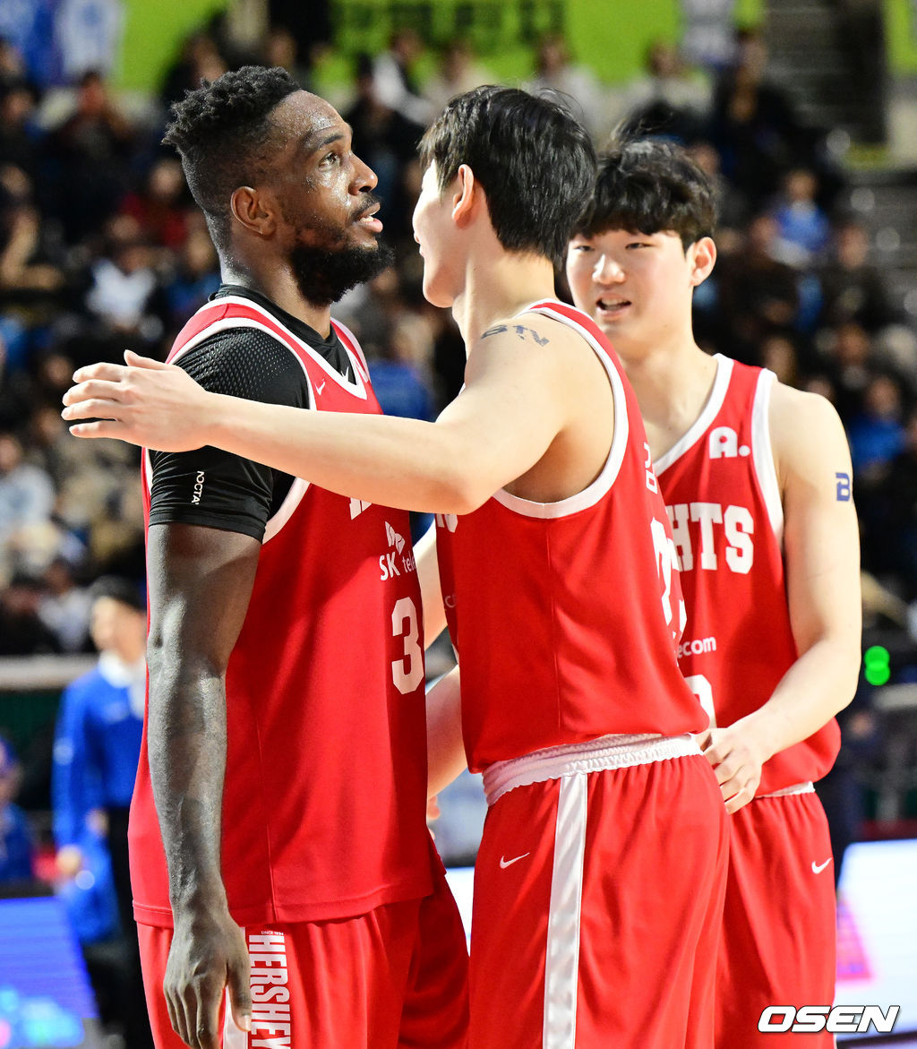 SK 워니가 트리플더블을 달성하며 동료선수들의 축하를 받고 있다. 2026.01.24 /jpnews@osen.co.kr