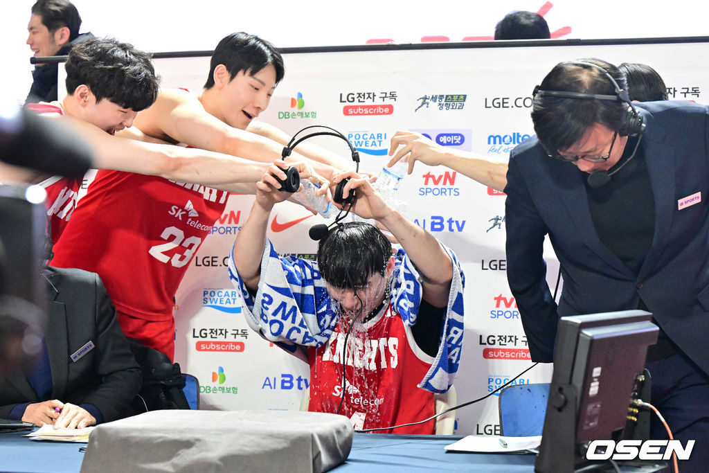 경기를 마치고 SK 김낙현이 방송 인터뷰를 준비하며 동료선수들의 물세례를 받고 있다. 2026.01.24 /jpnews@osen.co.kr