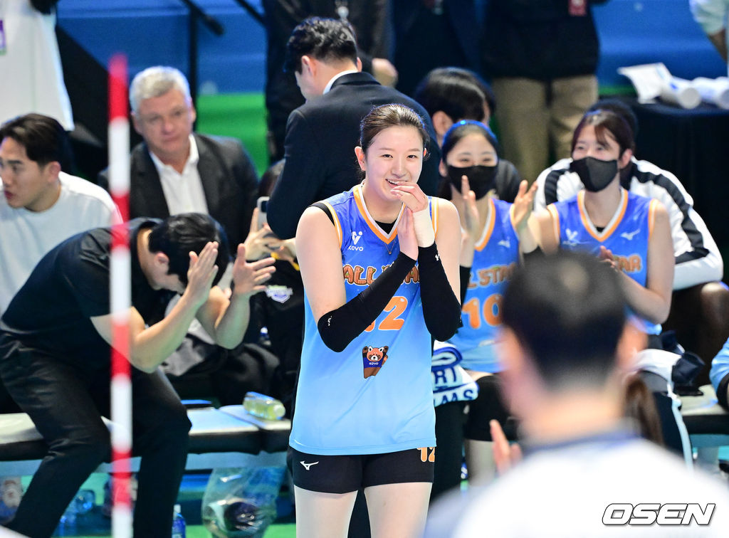 흥국생명 이다현이 현대건설 강성형 감독과 화사 '굿굿바이' 안무 세리머니를 선보이고 있다. 2026.01.25 /jpnews@osen.co.kr