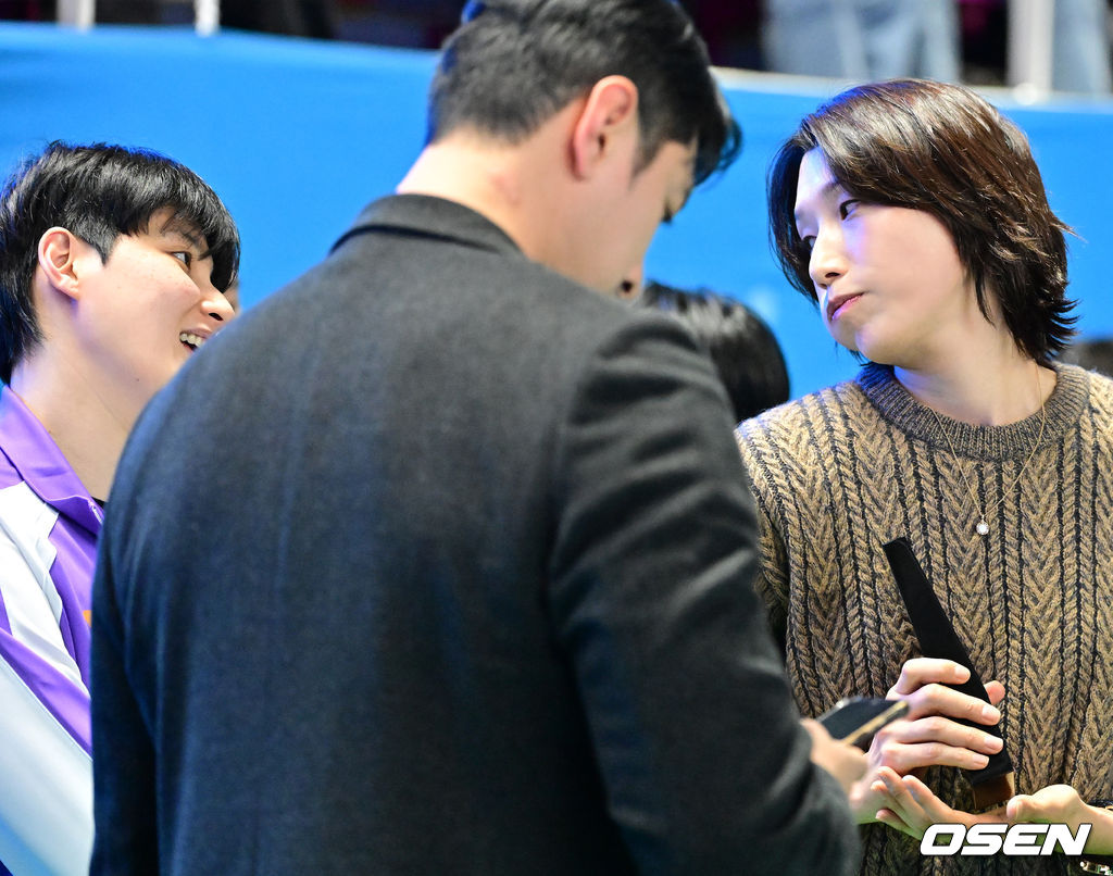 감사패를 받은 김연경이 현대건설 김희진과 이야기를 나누고 있다. 2026.01.25 /jpnews@osen.co.kr
