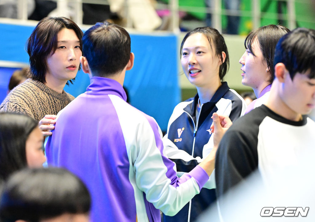 감사패를 받은 김연경이 한선수, 양효진, 박정아와 이야기를 나누며 즐거워하고 있다. 2026.01.25 /jpnews@osen.co.kr