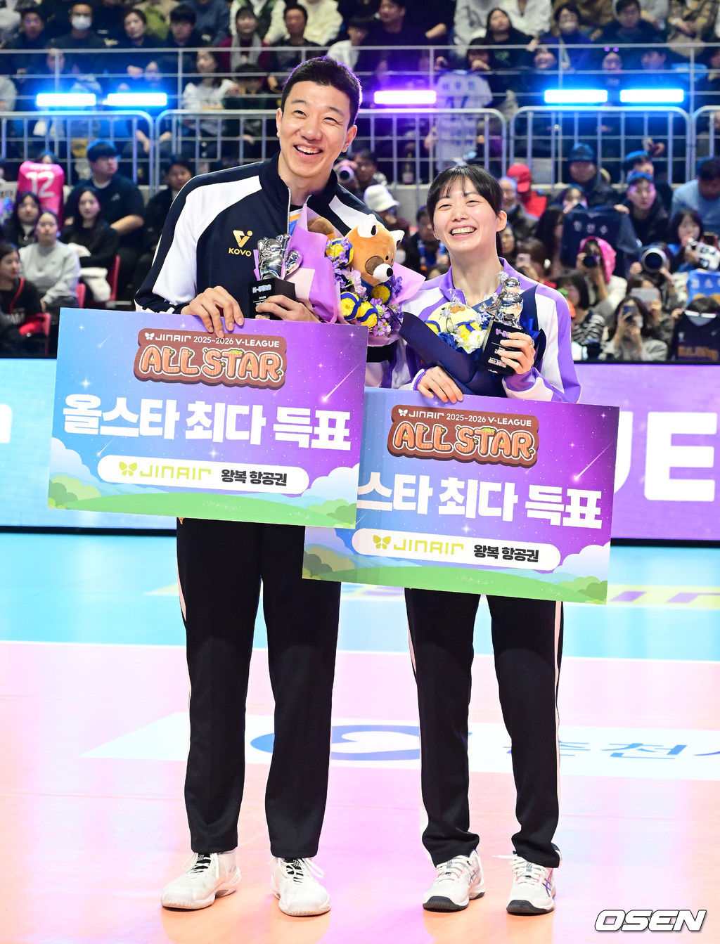 올스타 최다 득표에 선정된 한국전력 신영석, 현대건설 김다인이 기념 촬영을 하고 있다. 2026.01.25 /jpnews@osen.co.kr
