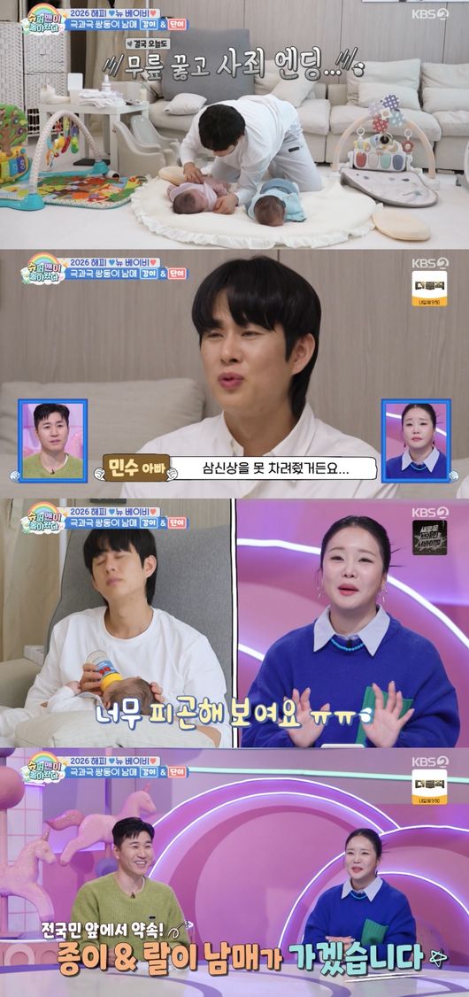 4일 방송된 KBS 2TV 예능 ‘슈퍼맨이 돌아왔다’에서는 손민수와 쌍둥이 남매 강이, 단이의 일상이 공개됐다.
