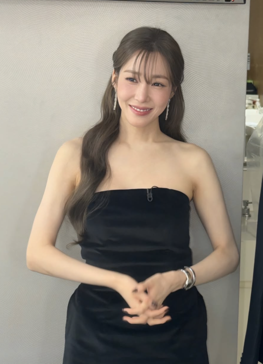 블랙 튜브톱 드레스에 자연스럽게 흐르는 웨이브 헤어, 과하지 않은 주얼리 매치는 티파니 특유의 세련된 무드를 극대화했다.