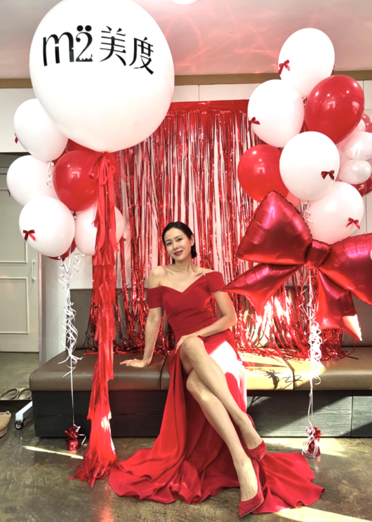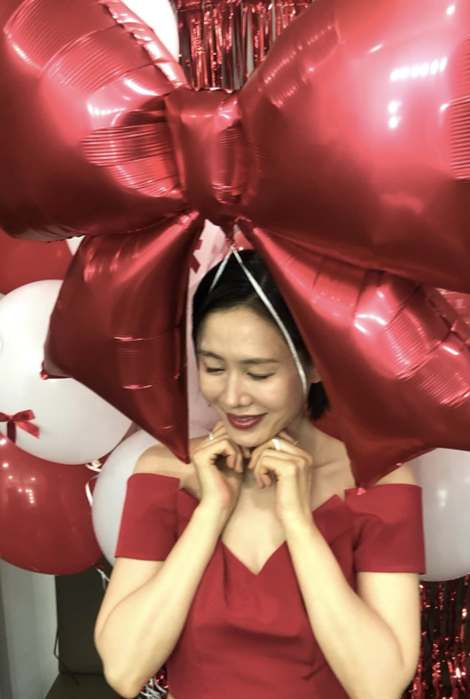특히 깊게 트인 슬릿 사이로 드러난 다리 라인은 ‘아찔’이라는 표현이 과하지 않을 정도. 풍성한 레드·화이트 벌룬 장식과 리본 오브제가 더해지며 마치 화보를 연상케 하는 장면을 완성했다. 단정하게 넘긴 헤어와 절제된 메이크업은 고급스러운 분위기를 배가시킨다.