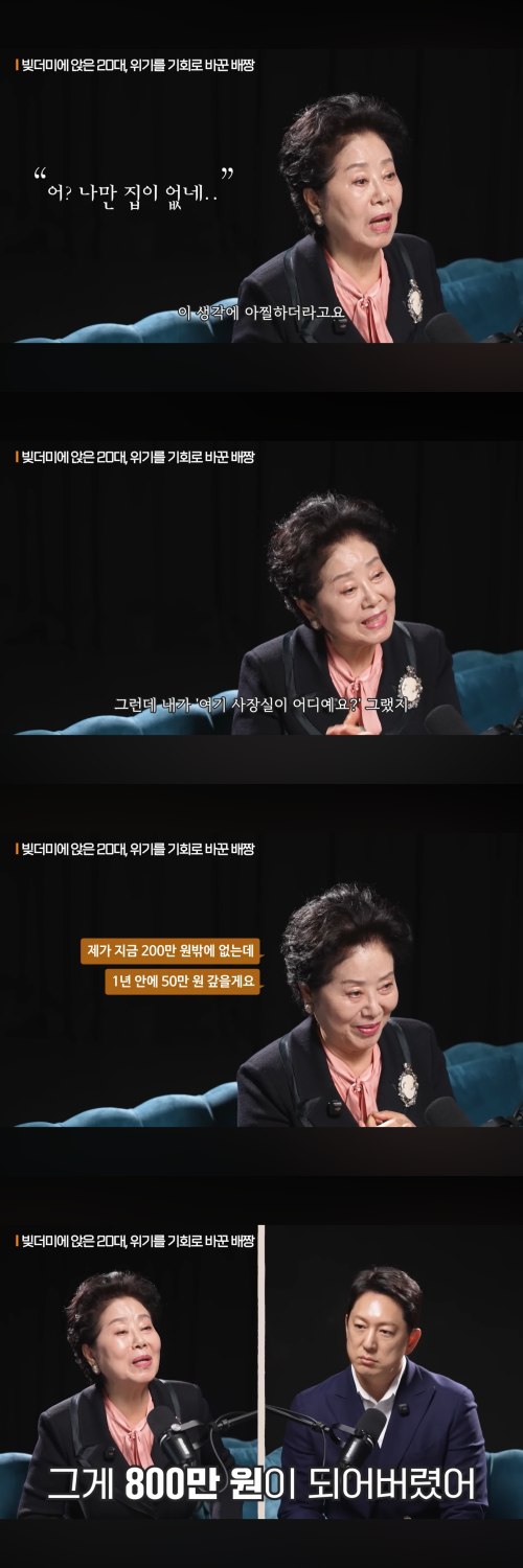 선우용여는 “연기 활동과 함께 부동산 공부를 병행했다”며 “그렇게 하나씩 옮겨 다니며 결국 1978년 무렵 큰 빚을 모두 정리할 수 있었다”고 전했다.