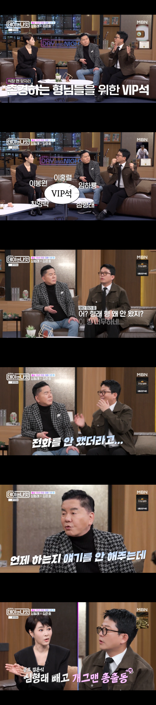 하지만 심형래는 “의자만 있으면 뭐 하냐. 결혼을 언제 하는지 말을 안 해줬다”며 억울함을 토로했다. 이에 김준호는 “하객 명단을 정리하다가 ‘형래 형 왜 안 오셨지?’ 하고 나서야 전화를 안 드렸다는 걸 알았다”고 말해 웃음을 더했다.