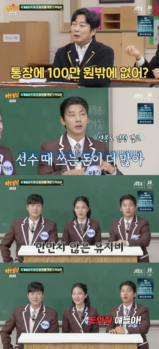 화제의 통장 잔고 이야기도 나왔다. 이상민이 “통장에 100만 원밖에 없냐”고 묻자, 곽윤기는 “선수 때는 쓰는 돈이 많다. 연봉도 낮고, 스케이트 유지비가 많이 든다”며 “모은 돈이 많지 않다. 도와줘 얘들아”라고 웃어 보였다.