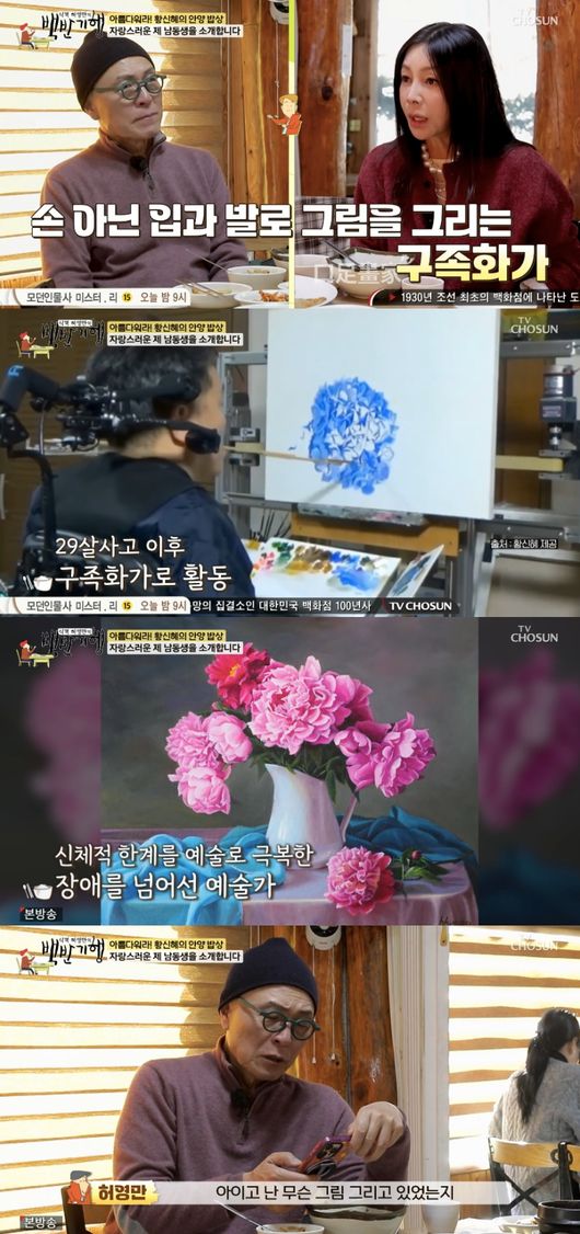 이날 황신혜는 남동생 황정언 씨에 대해 “화가다. 구족 화가 아시죠”라고 알렸다. 구족화가는 손이 아닌 입과 발로 그림을 그린다. 이에 허영만이 “몸이 좀 불편하냐”고 조심스레 물었다.