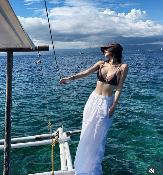 12일 이솔이는 자신의 소셜 계정에 다양한 사진을 공개했다. 구름이 가득한 푸른 하늘과 청록빛 바다 물결이 아름다운 곳을 배경으로 둔 채 이솔이는 요트 위로 보이는 곳에서 끝을 잡고 서서 포즈를 취하고 있었다.