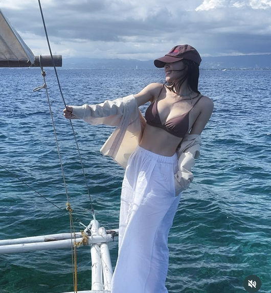 이날 이솔이는 브라운 톤 비키니로 탄탄한 복근을 자랑했다. 하의는 아마천 소재의 흰 바지를 입어 시원하면서도 노출 없는 컷을 완성했다.