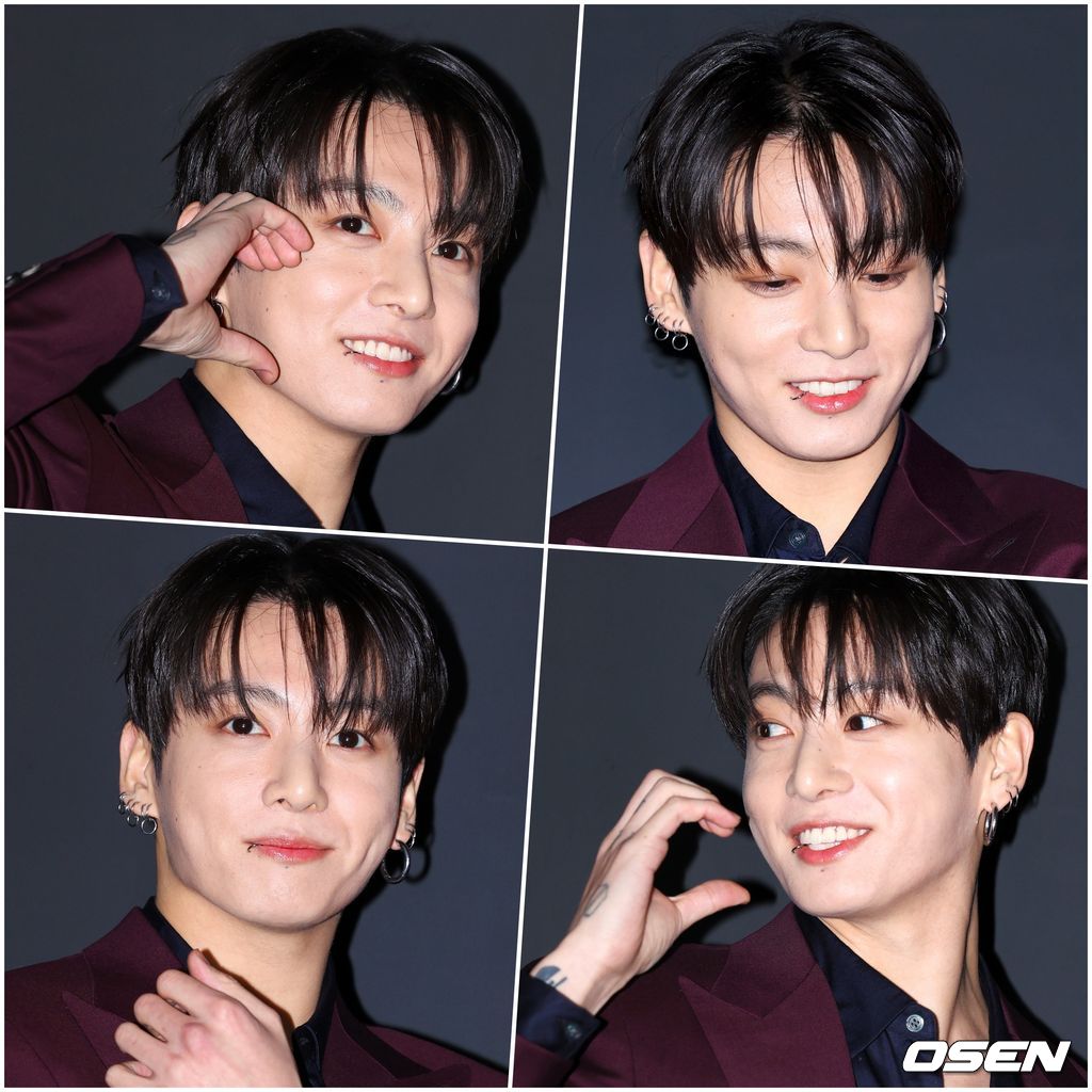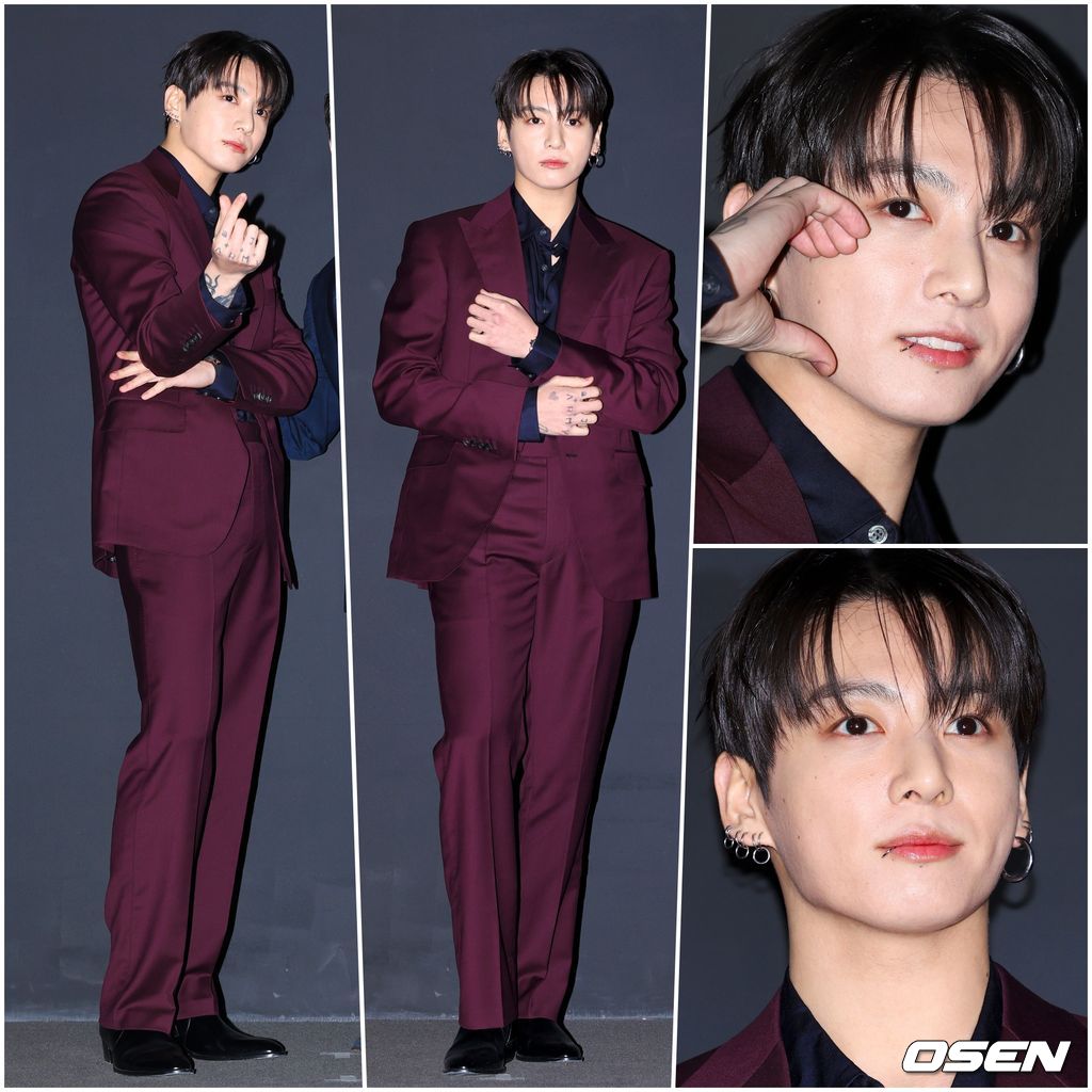 정국은 딥한 버건디 수트로 단숨에 시선을 사로잡았다. 이너로는 단추를 살짝 풀어 힘을 뺀 블랙 셔츠를 매치해 자연스러운 섹시함을 더했다. 여기에 여러 개의 이어링은 포인트.