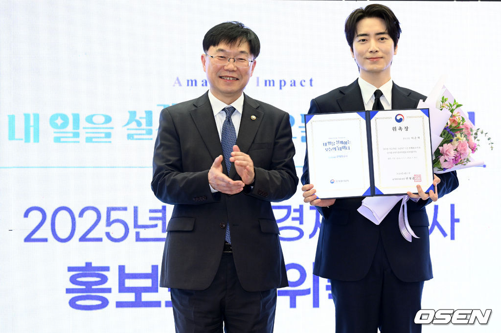 안형준 국가데이터처장(왼쪽)과 배우 이준혁이 포즈를 취하고 있다. 2026.04.01 /cej@osen.co.kr