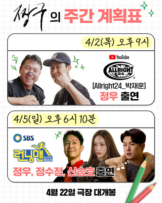 특히 2001년 데뷔 이후 꾸준한 활동을 이어온 정우가 '런닝맨'에 데뷔 25년 만에 출연하며 그동안 보여주지 않았던 색다른 매력과 예능감을 선보일 것으로 기대를 모은다. 영화 속 ‘짱구’의 에너지를 예능에서도 고스란히 전하며 시청자들에게 강한 인상을 남길 전망이다.  정우는 최근 전 소속사 BH엔터테인먼트와 8년 동행을 마무리해 화제를 모으기도 했다.
