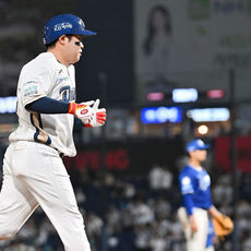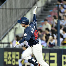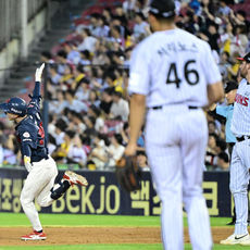 달아나는 솔로포 뽑아내며 기뻐하는 롯데 이호준