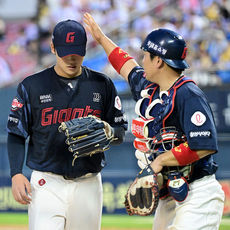 롯데 선발 이민석 격려하는 유강남, '잘 막아내고 있어'