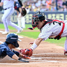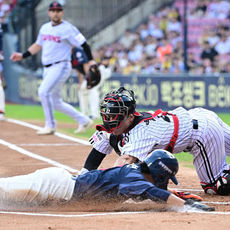 박동원 태그보다 먼저 홈 베이스 쓸어내는 황성빈