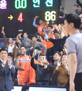 기뻐하는 전자랜드 벤치,'3차전 잡았어'