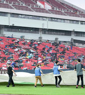갑작스런 비에 방수포 덮는 kt위즈파크