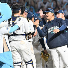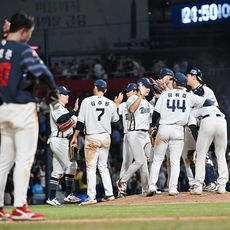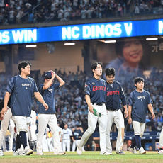 승리 기쁨 나누는 NC 이호준 감독과 선수들