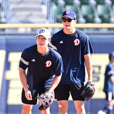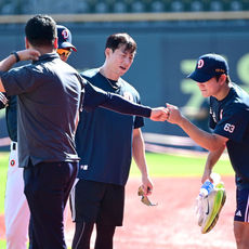 두산 조성환 감독대행, '김택연과 주먹 하이파이브 나누며'