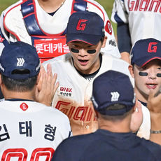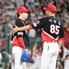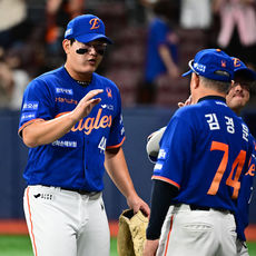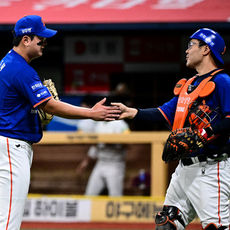김태형 감독과 승리 하이파이브하는 박찬형과 이호준