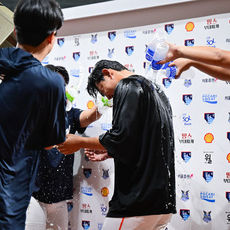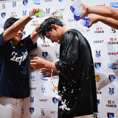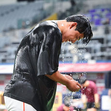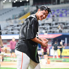 데뷔 첫 10승 달성 문동주,'시원한 축하 물세례'