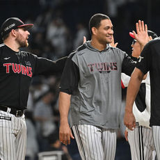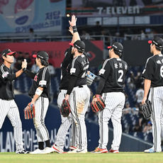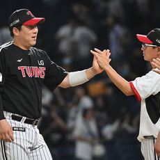 치리노스, 오스틴과 승리 하이파이브하는 LG 염경엽 감독