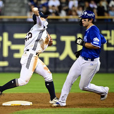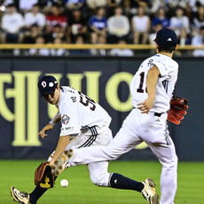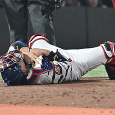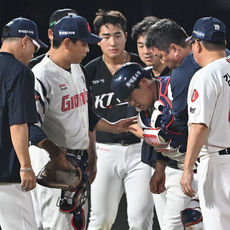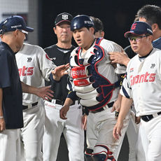 파울 타구에 목 부상 유강남 바라보는 김태형 감독