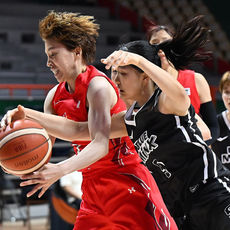 치열하게 리바운드볼 다투는 후지쯔(일본) 하야시 마호와 삼성생명 유하은