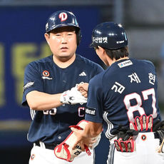 김인태, 선취 1타점 2루타 세리머니