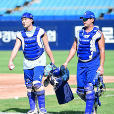 삼성 김재성-이병헌, '늦더위 속 훈련 마치고'