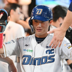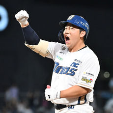 오영수, 동점 안타 환호