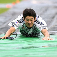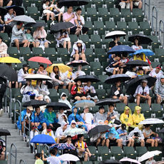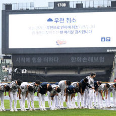 우산 쓰고 경기 시작 기다리는 야구팬들