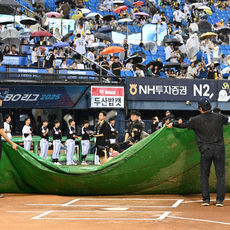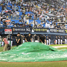 갑작스러운 비로 방수포 깔리는 잠실야구장