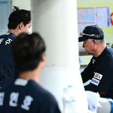 호투 펼친 한화 선발 문동주 향해 격려 전하는 한화 김경문 감독