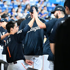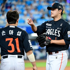호투 펼친 한화 선발 문동주, '손아섭과 독수리 세리머니'