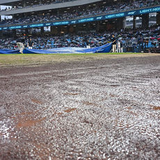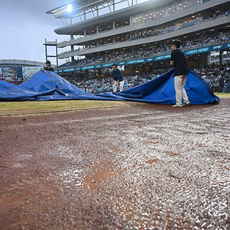 다시 비 내리는 비로 방수포 덮는 창원NC파크