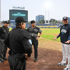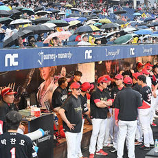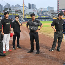 NC 서재응 코치와 KIA 손승락 코치 그리고 심판들, 비는 일단 피합시다.